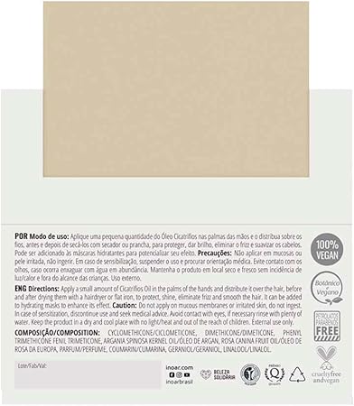 Modo de uso: Aplique uma pequena quantidade do Óleo 7ml Cicatrifios – Inoar na palma das mãos e o distribua sobre os cabelos, antes e depois de secá-los com secador ou prancha, para proteger, dar brilho, eliminar o frizz e suavizar os cabelos.